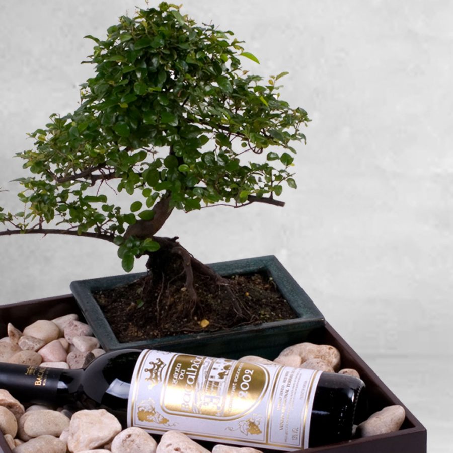 Esta caixa junta em harmonia o estilo zen do bonsai, com um bom vinho de terras do Sado, O Quinta da Bacalhôa (750ml), cor rubi e uma sensação gustativa cheia, robusta e apimentada.