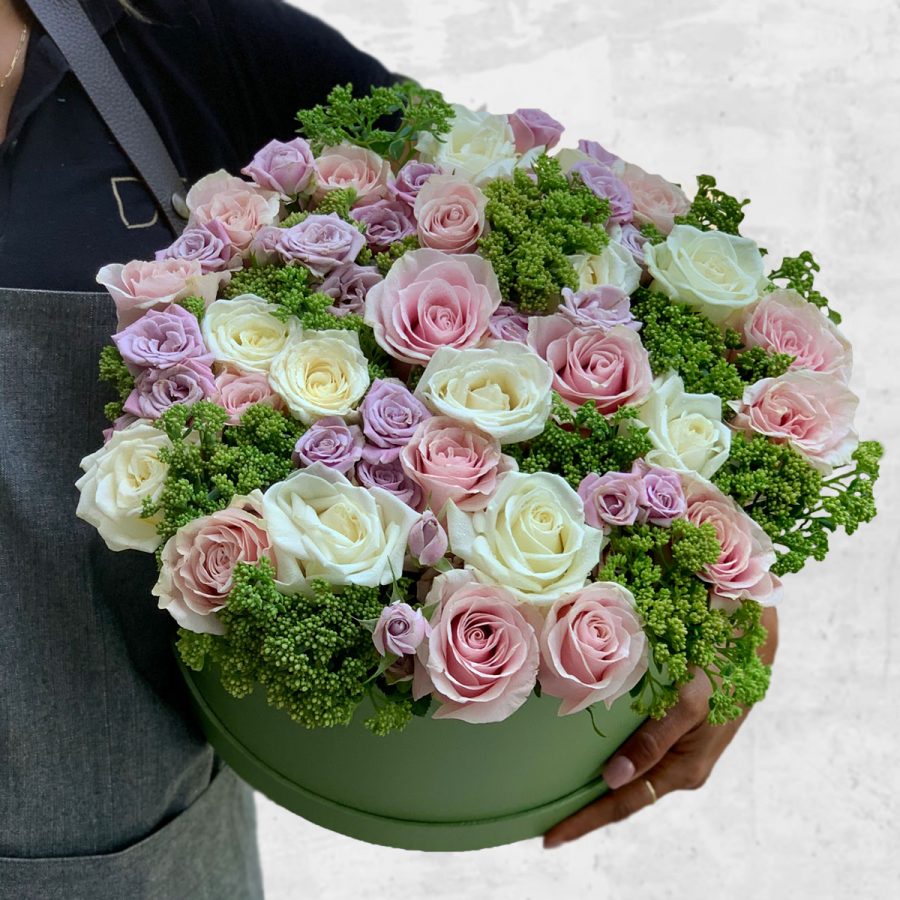 Caixa redonda com Rosas chá, rosas cor-de-rosa, rosas lilases e verdes da época. Preparada delicadamente numa caixa de cartão.