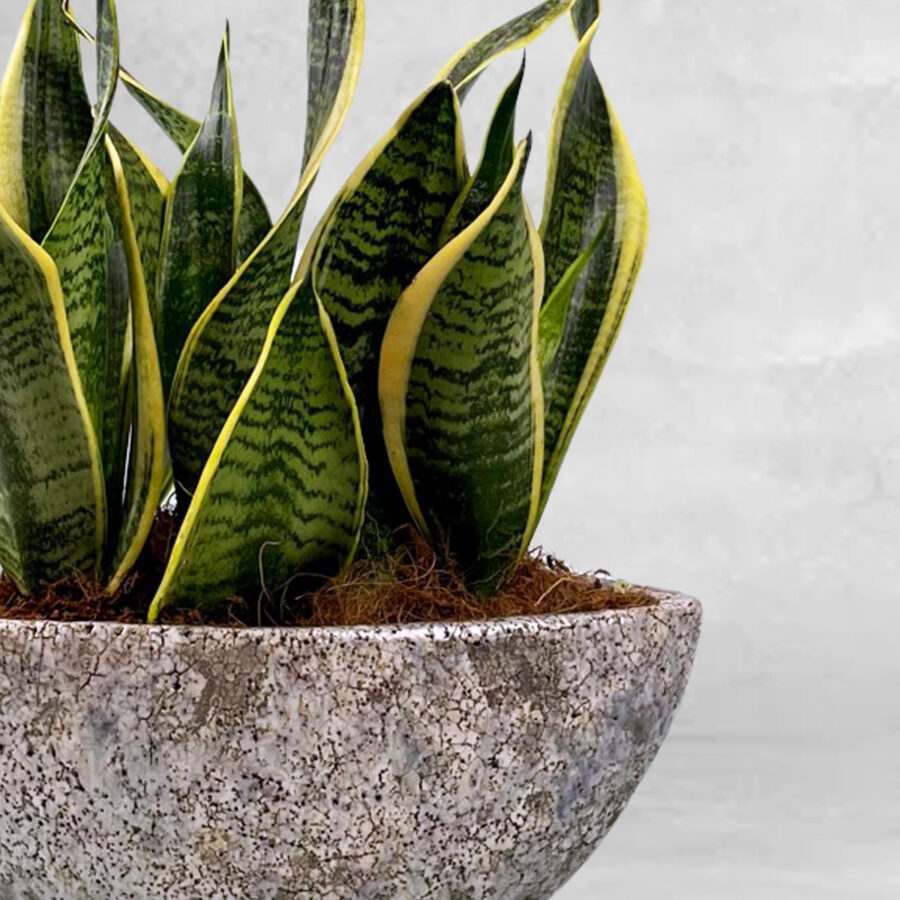 Uma composição no vaso oval cimento cinza, com 2 plantas “Sansevieria Trifa “Futura Superba”.
